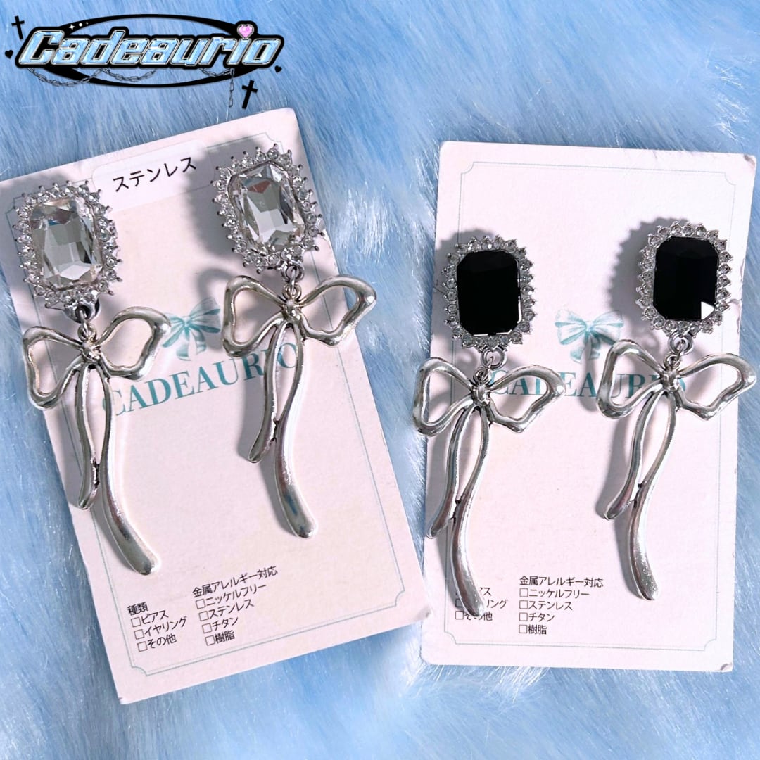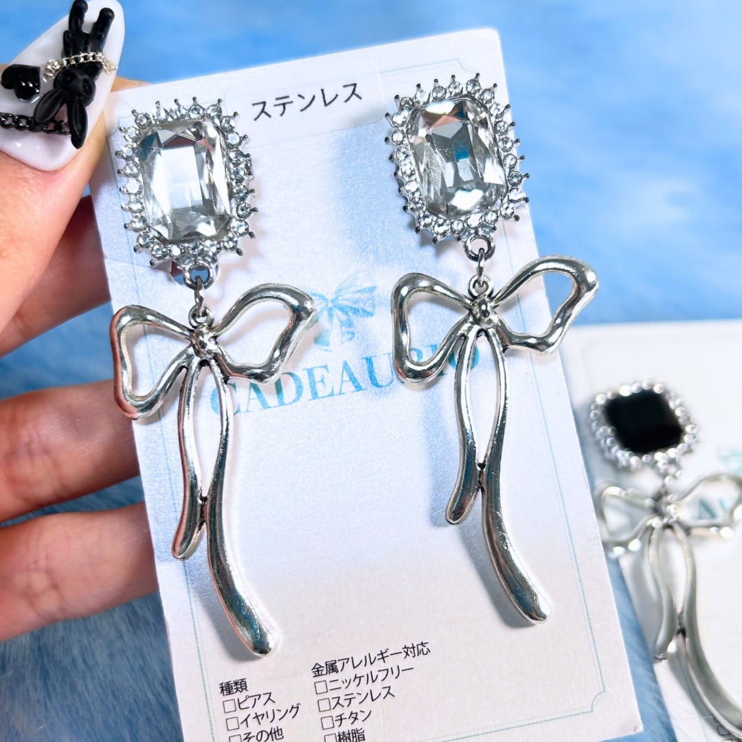 シルバーリボンの甘さに、スクエアビジューの上品な輝きがスパイスを添えるデザイン。